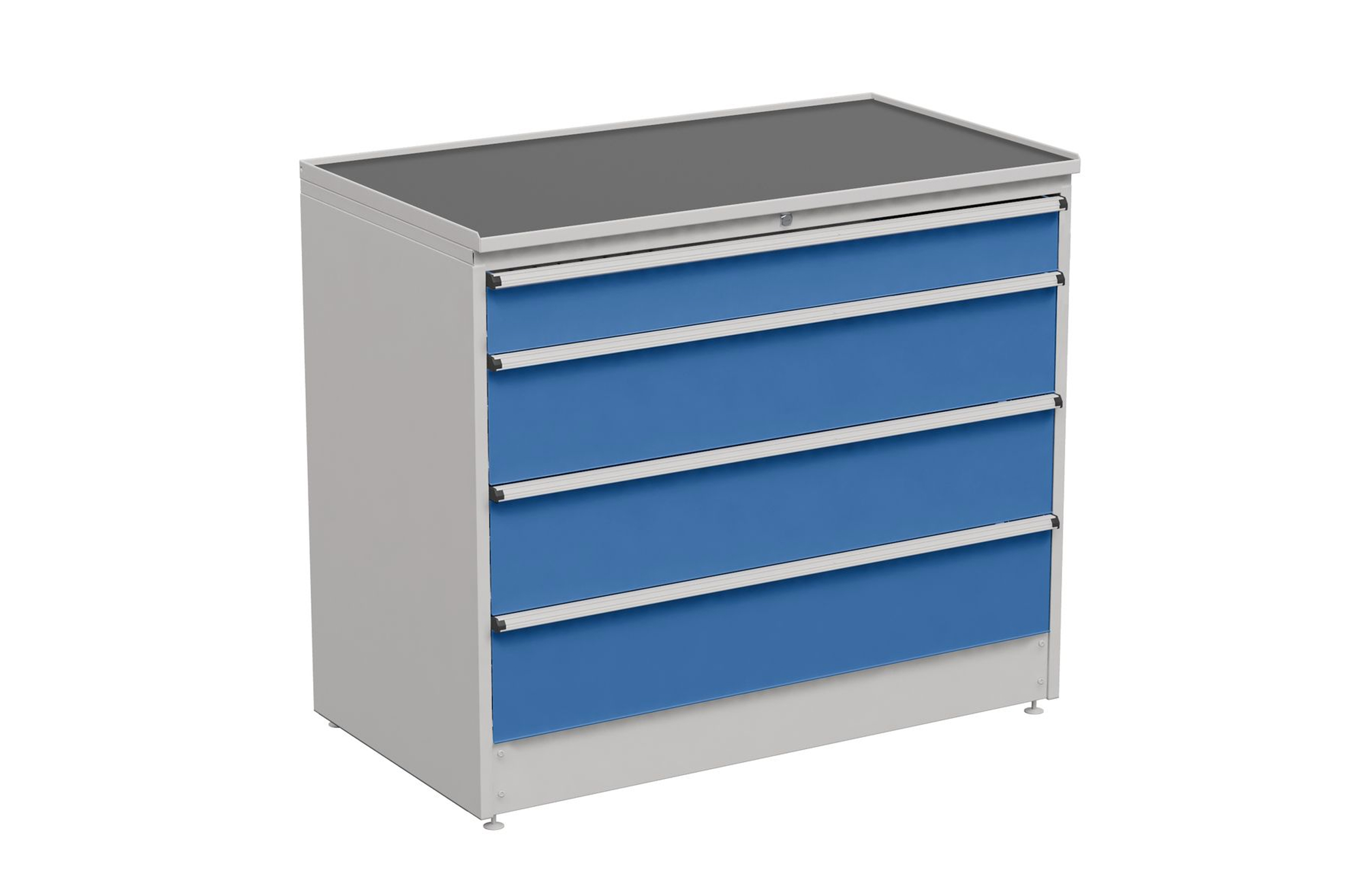 Pasūtījuma kods: 615 07 021 Korpuss un atvilktnes izgatavoti no tērauda, virsmas ar pulvera pārklājumu, korpuss gaiši pelēkā krāsā (RAL 7035), atvilktnes zilā krāsā (RAL 5007). Alumīnija rokturos ir vieta etiķetēm. Skapīti ir viegli pārvietot ar zemu pacēlāju, jo virsma zem atvilktnēm priekšā un aizmugurē ir noņemama. Kājiņas regulējās.