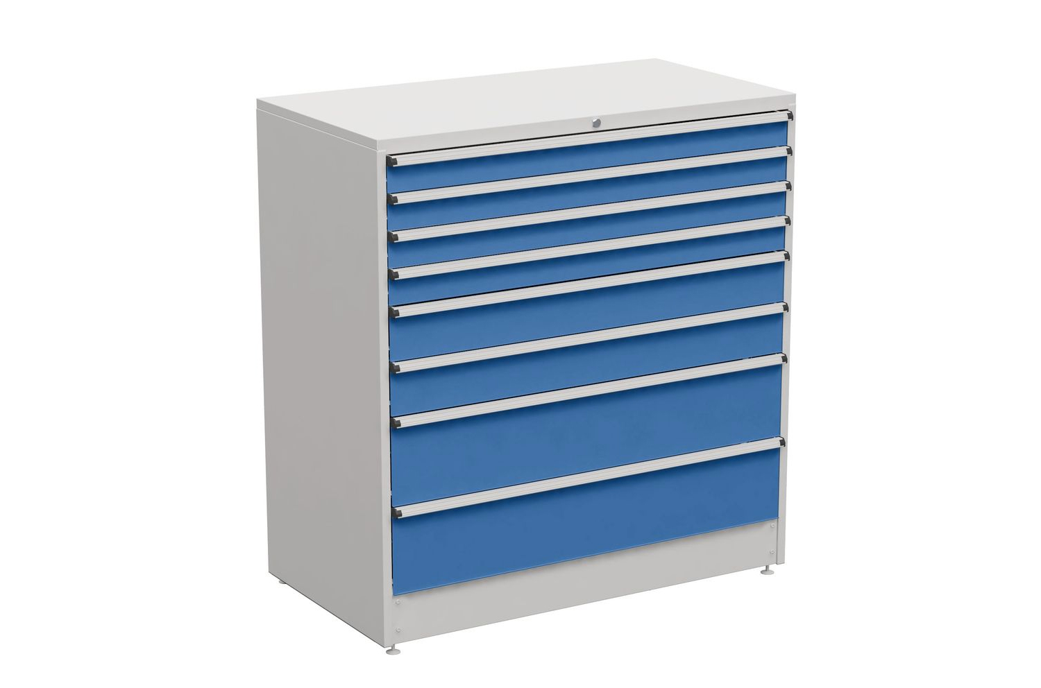 Pasūtījuma kods: 618 07 003 Korpuss un atvilktnes izgatavoti no tērauda, virsmas ar pulvera pārklājumu, korpuss gaiši pelēkā krāsā (RAL 7038), atvilktnes zilā krāsā (RAL 5007). Alumīnija rokturos ir vieta etiķetēm. Skapīti ir viegli pārvietot ar zemu pacēlāju, jo virsma zem atvilktnēm priekšā un aizmugurē ir noņemama. Kājiņas regulējās.