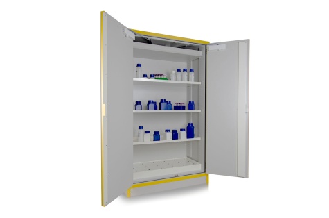 Chemical cabinet with a bottom tray and three movable shelves.The cabinet is fire tested for 30 minutes according to EN 14470-1. Equipped with self-closing doors, which closes automatically at a temperature rise of 50 ° C in the room. Doors are locked separately. Connection socket (Ø100 mm) for supply and exhaust air.