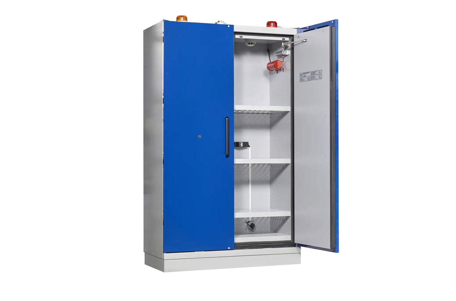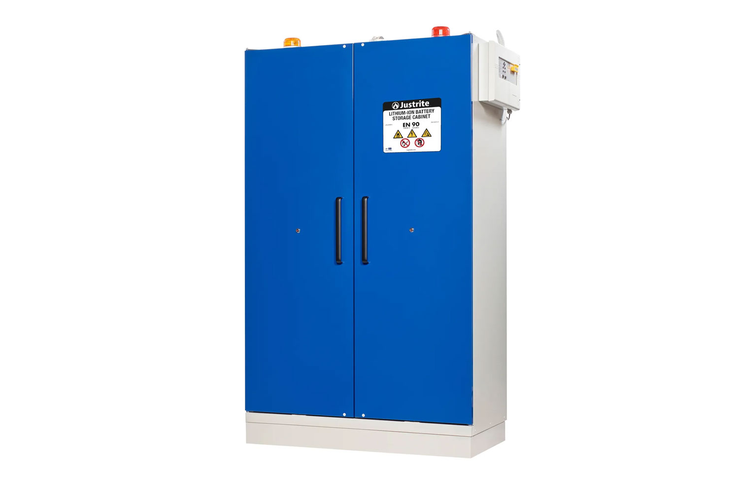The Justrite lithium battery EN cabinet is equipped with the latest safety technology to provide additional protection to employees and property from potential hazards associated with the storage, handling, and charging of lithium-ion batteries. Fire tests that meet stringent international standards, such as EN 14470-1, confirm that the cabinet meets all fire safety requirements to act as a safety barrier, protecting stored lithium-ion batteries from overheating due to external fires for at least 90 minutes, preventing battery ignition, instability, or explosion.